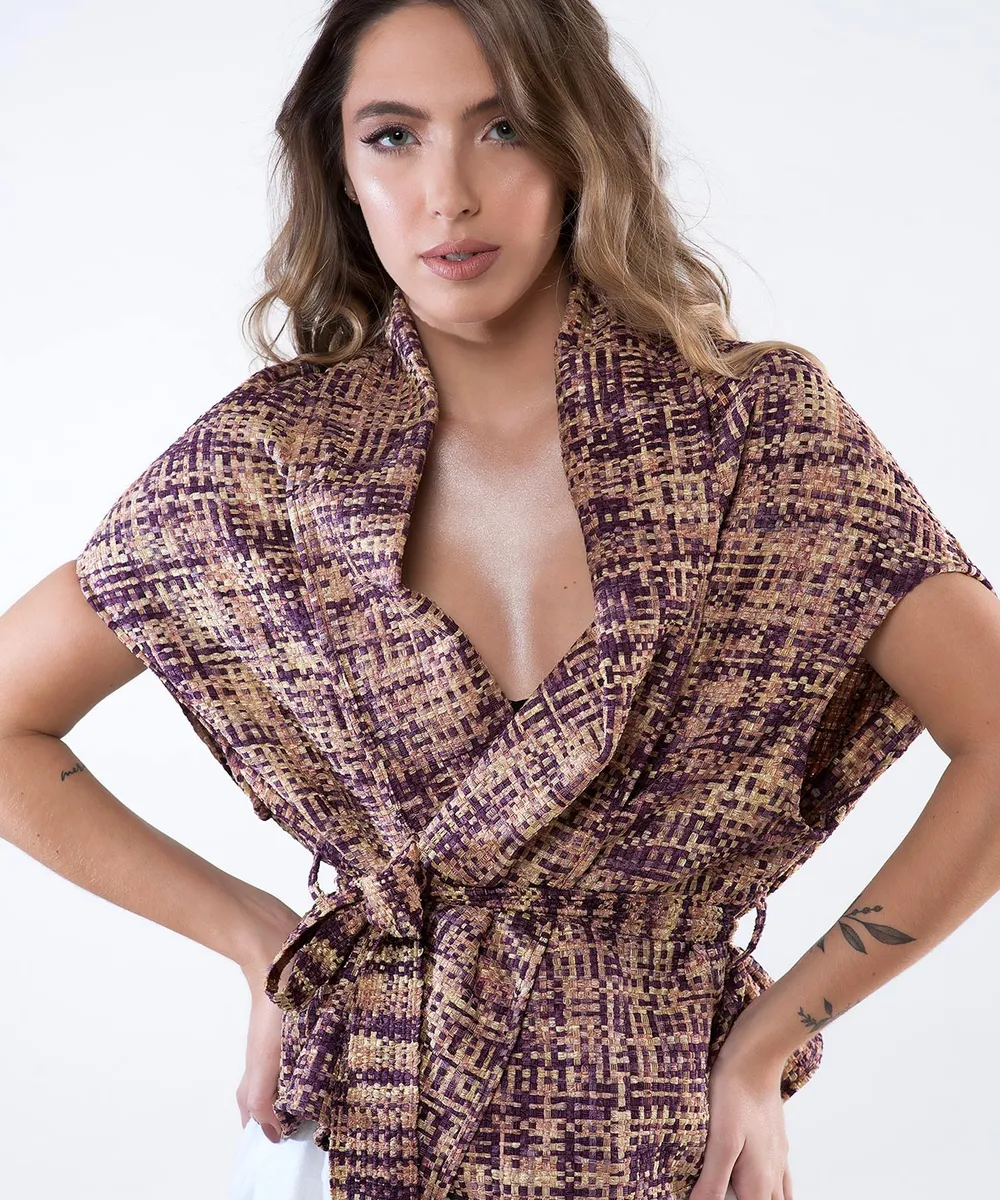 Produzido com a fita Trilogy, de toque sedoso e levemente encorpado, o kimono apresenta caimento suave e elegante, acompanhando os movimentos do corpo com naturalidade. Sua modelagem versátil permite diversas combinações — sobre vestidos, blusas ou peças de praia — tornando-se um item indispensável para diferentes ocasiões e estações.