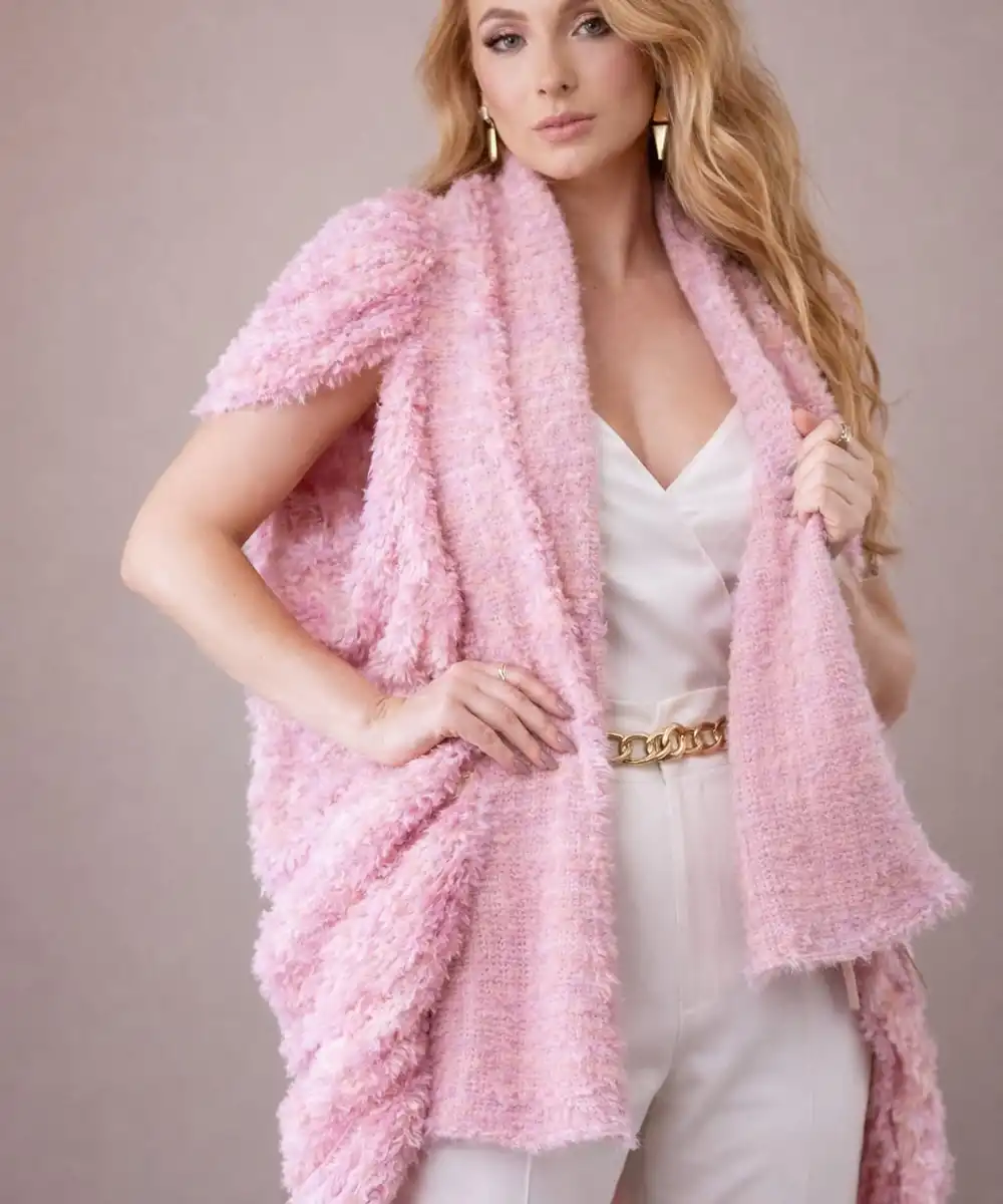 Produzida com a fita Cuba Libre, reconhecida por sua maciez e conforto térmico, essa peça envolve o corpo com suavidade, proporcionando aquecimento sem abrir mão da leveza. Seu design oval, com manga curta e a parte frontal levemente mais longa, cria um caimento elegante e funcional, valorizando diferentes silhuetas e permitindo múltiplas formas de uso.