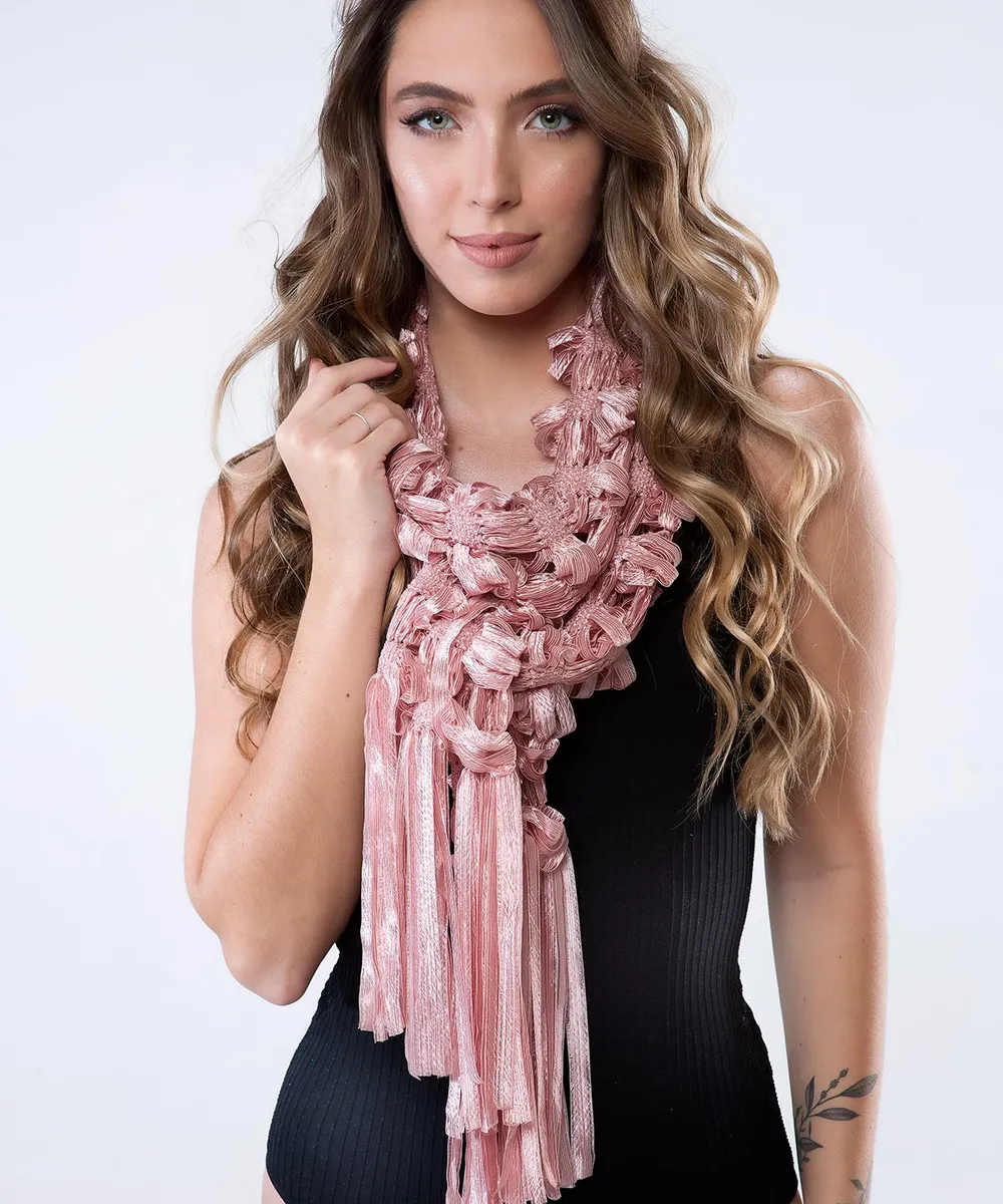 Produzido com a fita Trilogy, de toque sedoso e estrutura levemente mais encorpada, o lenço envolve com suavidade, criando movimento e leveza ao visual. Seu design atemporal permite diferentes formas de uso, acompanhando a mulher Moça Prendada em diversas ocasiões, com conforto e personalidade.