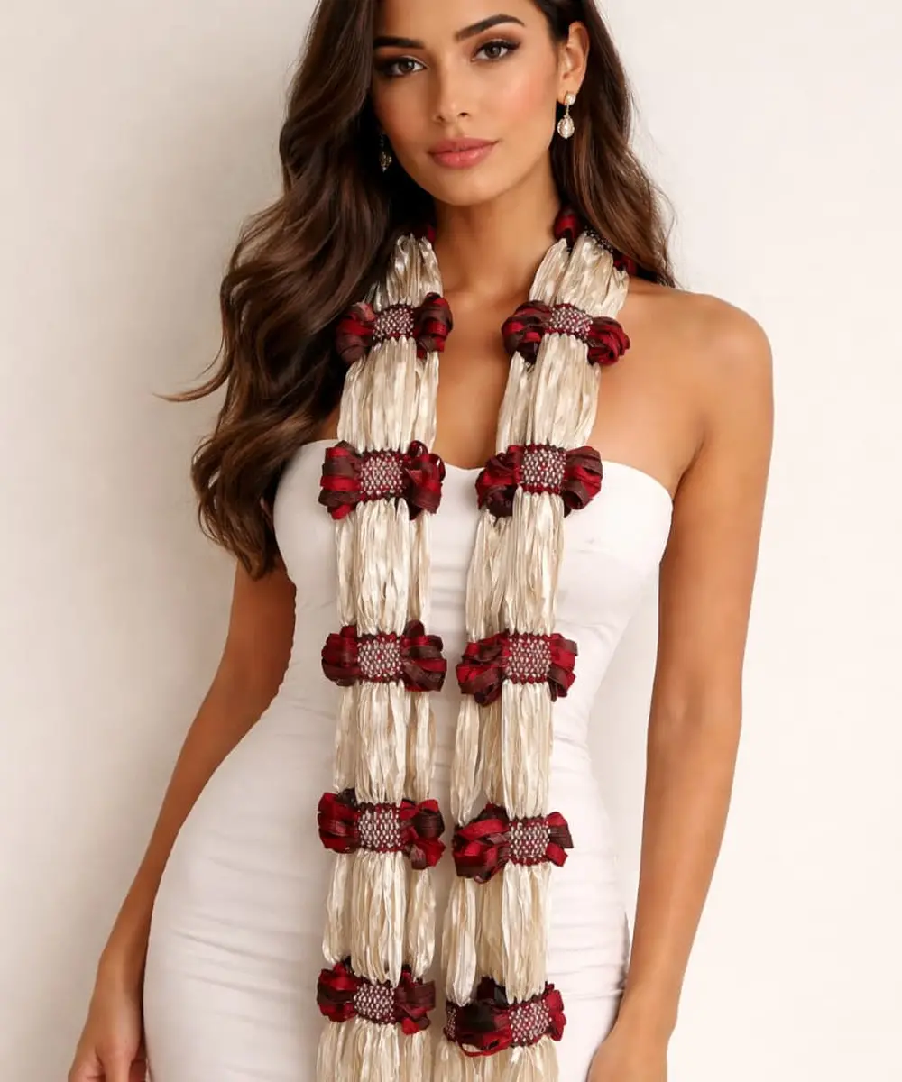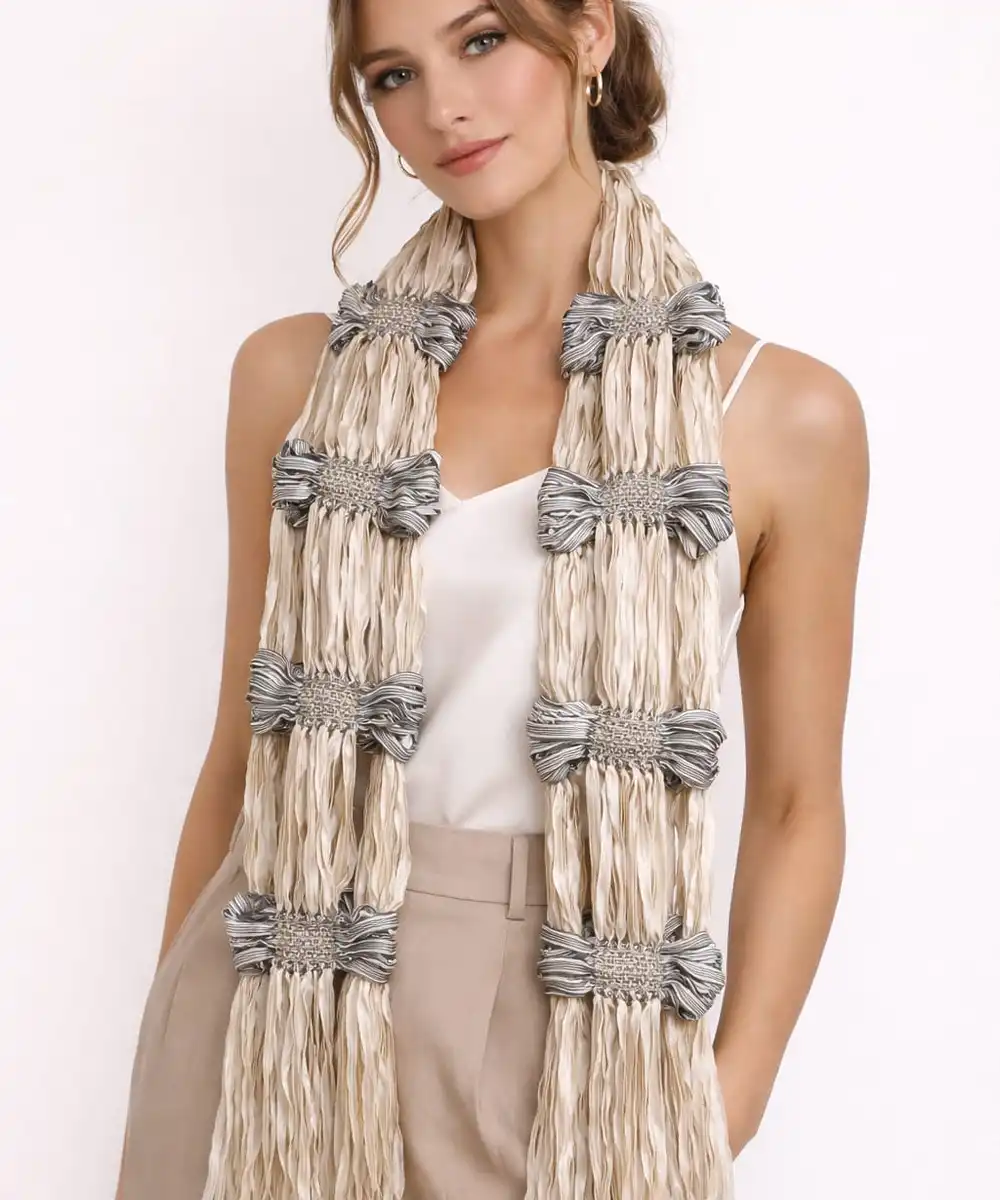 Produzido com as fitas Starget e Trilogy, de toque sedoso e textura suave, o lenço envolve com leveza, proporcionando conforto e fluidez ao visual. Seu design atemporal permite diferentes formas de uso, acompanhando a mulher Moça Prendada em diversas ocasiões, com naturalidade e charme.